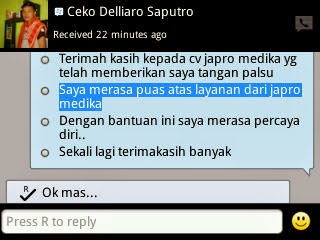 Terima kasih banyak kepada Japro Medika yang telah membuatkan saya tangan palsu. Saya merasa puas atas layanan dari Japro Medika. Dengan bantuan ini saya merasa percaya diri. Sekali lagi terima kasih banyak.